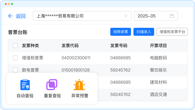 - 重复检测:AI识别重复发票,防止重复报销/抵扣